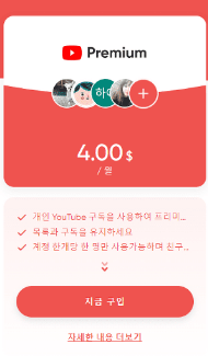 이렇게 해서 비용을 분담하면 1/5 가격으로 유튜브 프리미엄서비스를 이용하실 수가 있습니다.